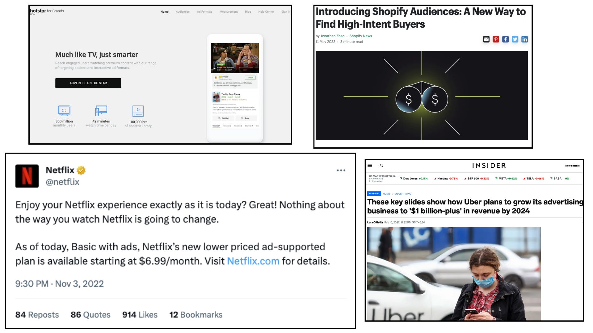 My guess is that a lot of new platforms are going to start serving ads and existing platforms will make a lot of money through ads. We can already see that happening with Hotstar, Uber, Netflix, Shpoify and Indian startups won't be far off too.
