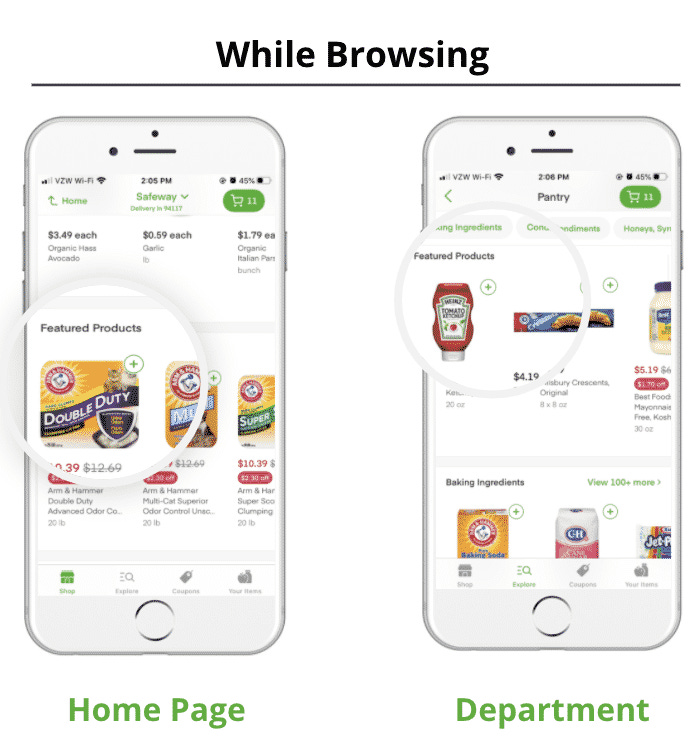Instacart allows users to purchase groceries and other packaged goods from nearby stores via Instacart’s mobile app and from its website. Instacart’s ad product allows brands to display their products prominently in various placements (search results, category discovery, post-checkout suggestions, hero banner) based on relevance. Notably, this “Featured Products” ad product is designed for brands to drive sales of their products.
