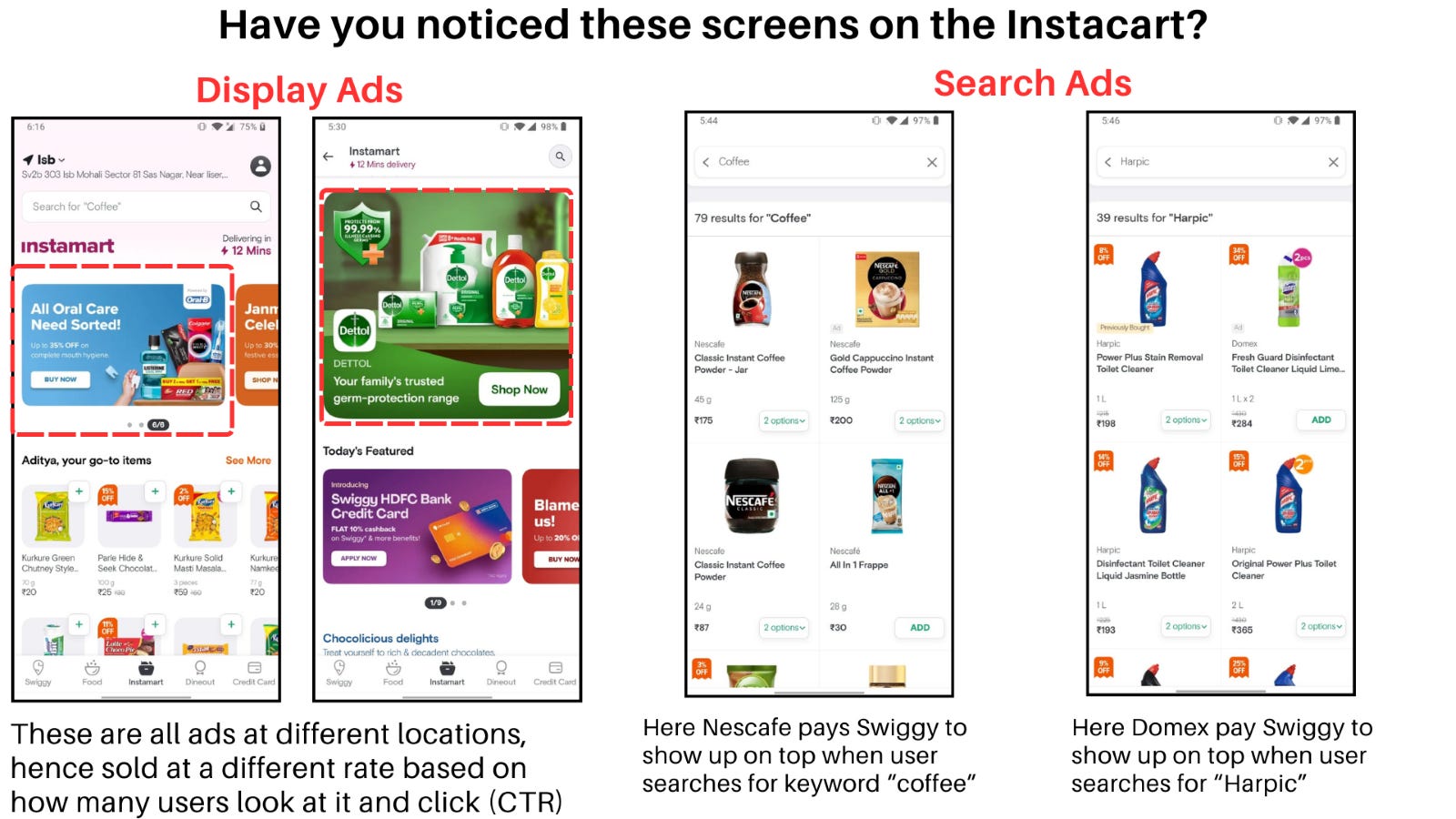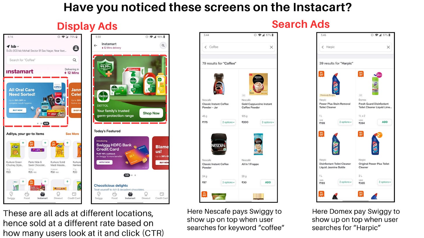 To give you an example from an Indian context – Pepsi can run a search ad on Instacart such that whenever someone searched for “Coke” they will see a sponsored result selling Pepsi.