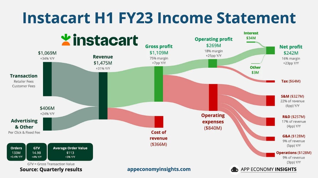 Ads seem to be working too. 40% of Instacart’s H1 FY23 revenue came from ads.